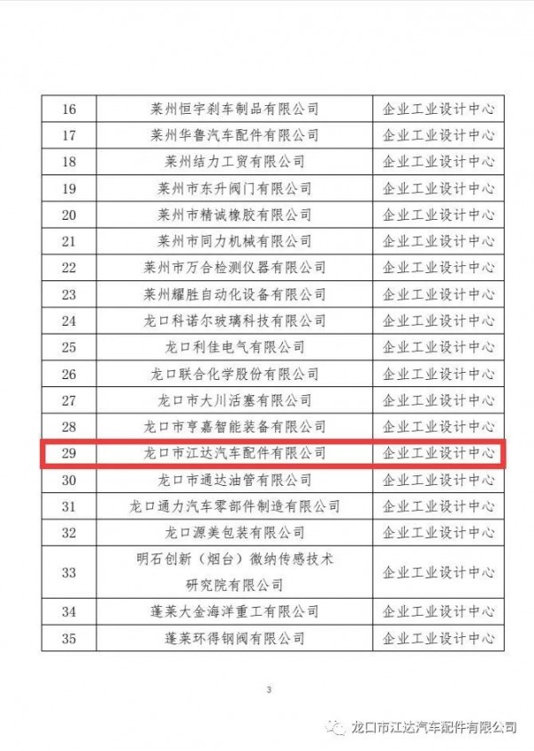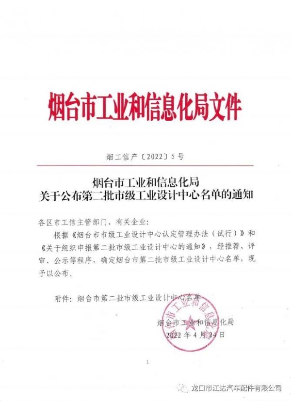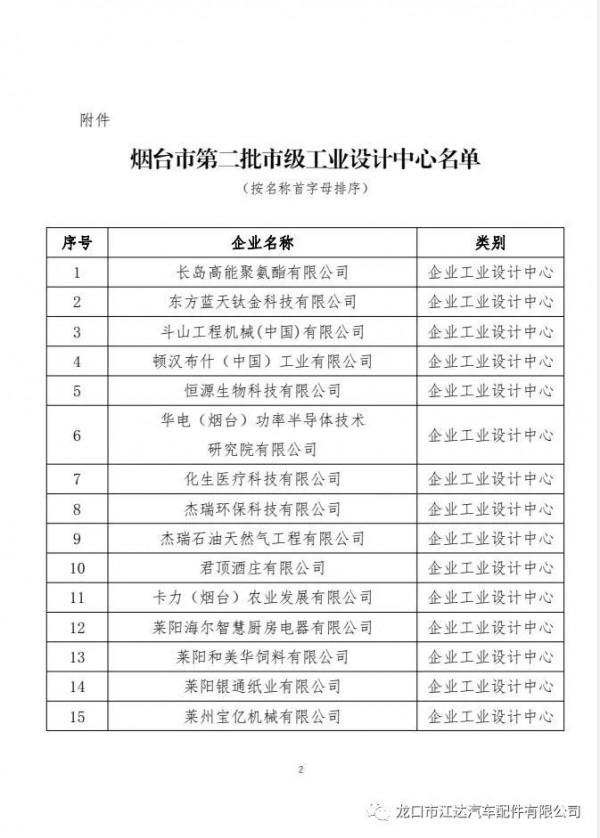 近日,煙臺市工業和信息局正式公布第二批煙臺市工業設計中心名單,龍口市江達汽車配件有限公司榜上有名,被確定為“煙臺市工業設計中心”。