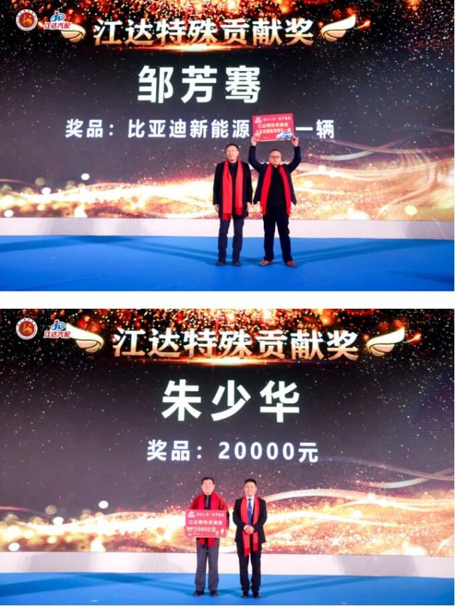 大會頒發令人激動的大獎,江達十年功勛獎和突出貢獻獎兩個大的獎項,獎勵比亞迪新能源電動轎車和現金。