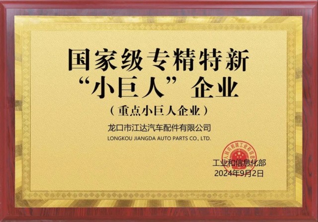 2024年11月,江達汽配新能源特種車輛零部件項目經過市級推薦申報,山東省工業信息化廳將龍口市江達汽車配件有限公司列為山東省第八批制造業單項冠軍企業。